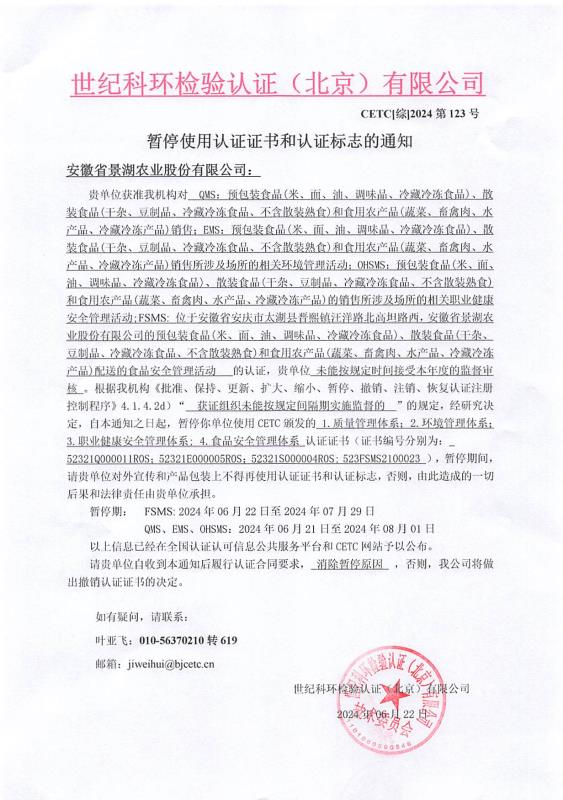 暫停使用認(rèn)證證書和認(rèn)證標(biāo)志的通知