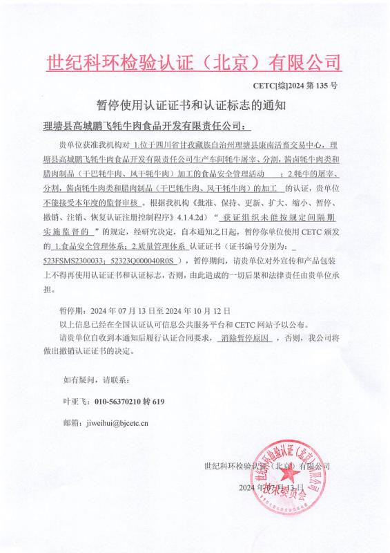 暫停使用認(rèn)證證書和認(rèn)證標(biāo)志的通知