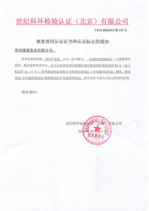 恢復(fù)使用認(rèn)證證書和認(rèn)證標(biāo)志的通知