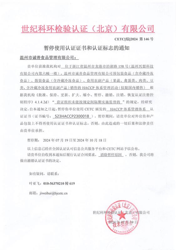 暫停使用認(rèn)證證書(shū)和認(rèn)證標(biāo)志的通知