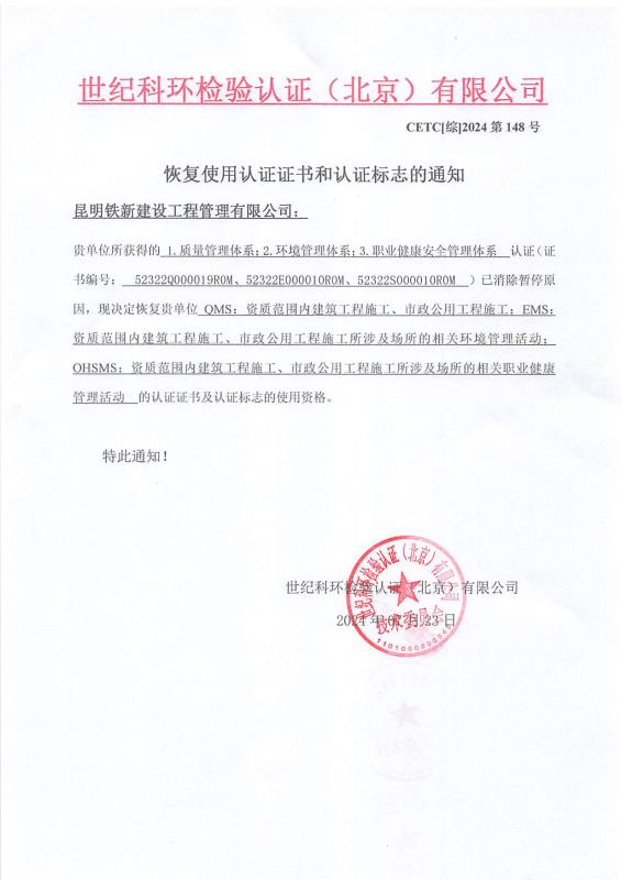 恢復(fù)使用認(rèn)證證書和認(rèn)證標(biāo)志的通知