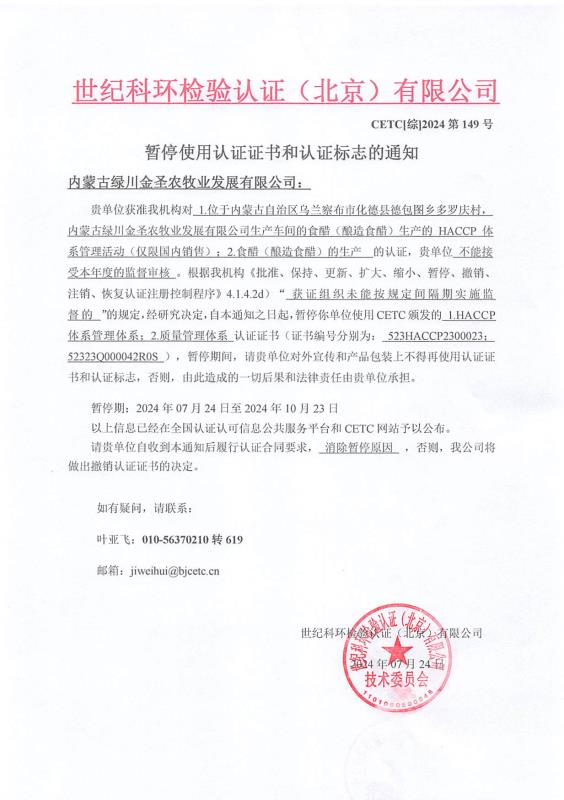 暫停使用認(rèn)證證書(shū)和認(rèn)證標(biāo)志的通知