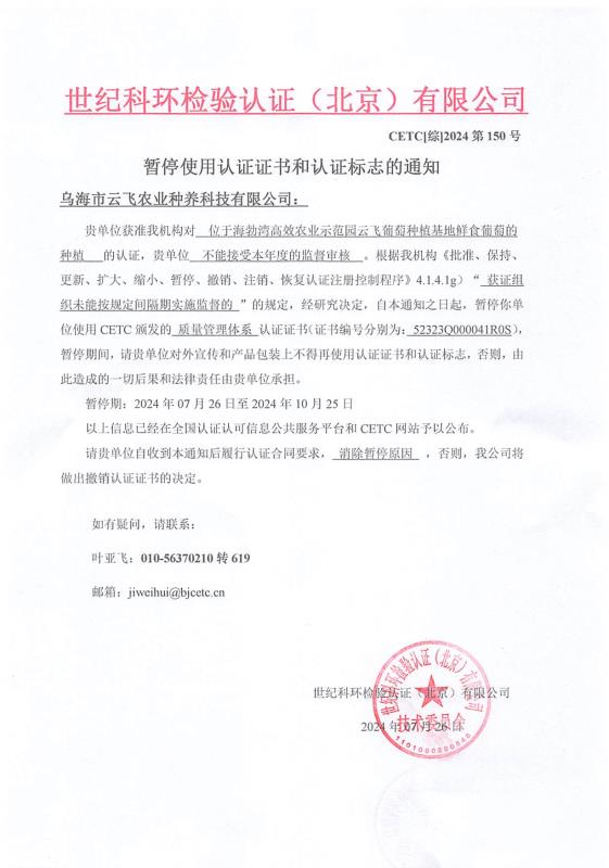 暫停使用認(rèn)證證書和認(rèn)證標(biāo)志的通知