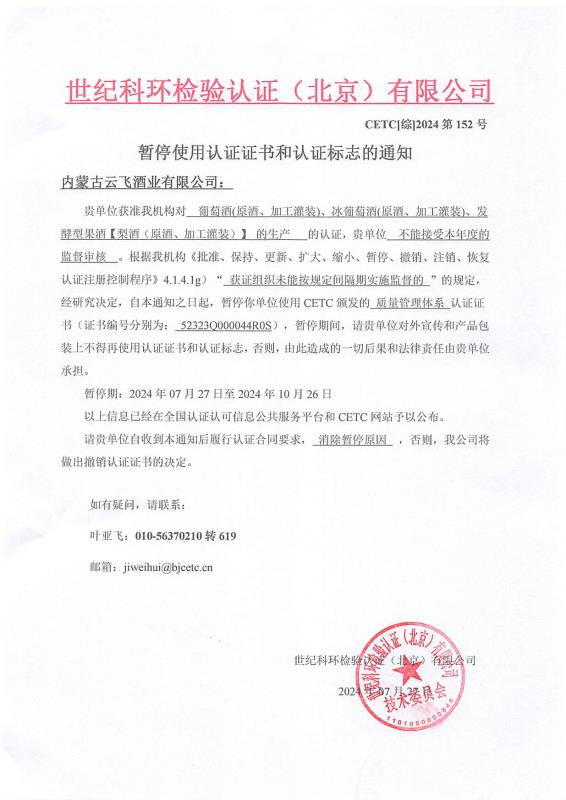 暫停使用認(rèn)證證書和認(rèn)證標(biāo)志的通知