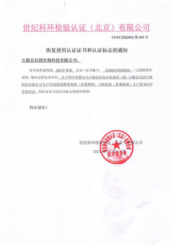 恢復(fù)使用認(rèn)證證書和認(rèn)證標(biāo)志的通知