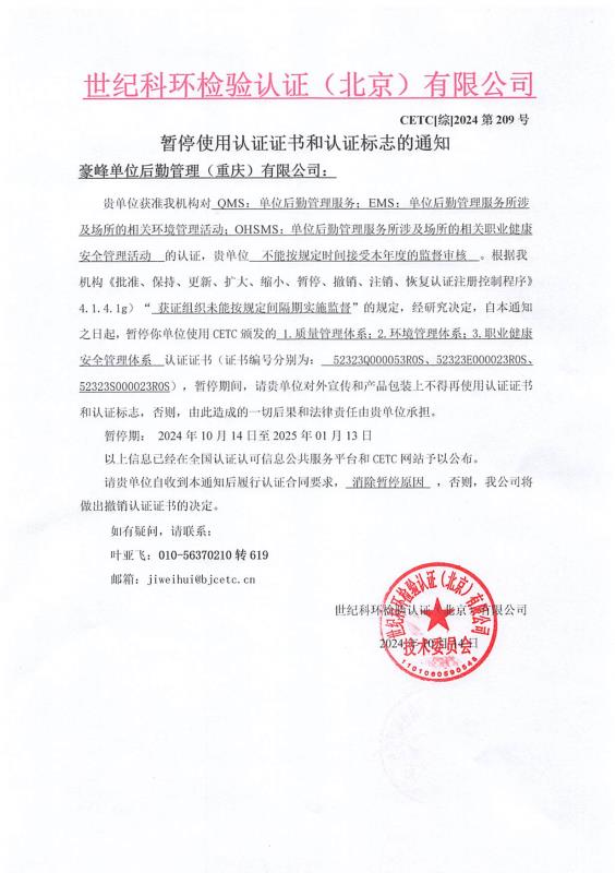 暫停使用認(rèn)證證書和認(rèn)證標(biāo)志的通知
