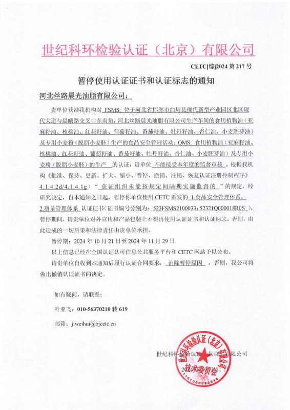 暫停使用認(rèn)證證書和認(rèn)證標(biāo)志的通知
