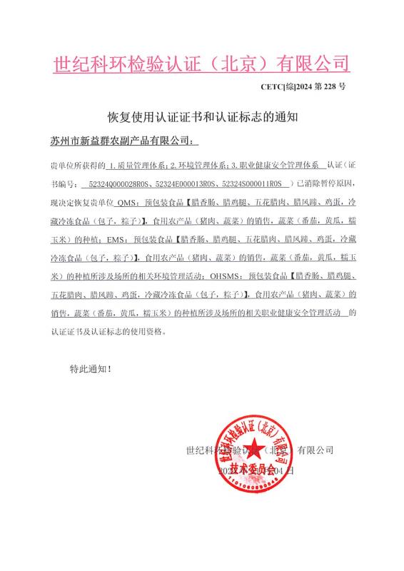 恢復(fù)使用認(rèn)證證書和認(rèn)證標(biāo)志的通知