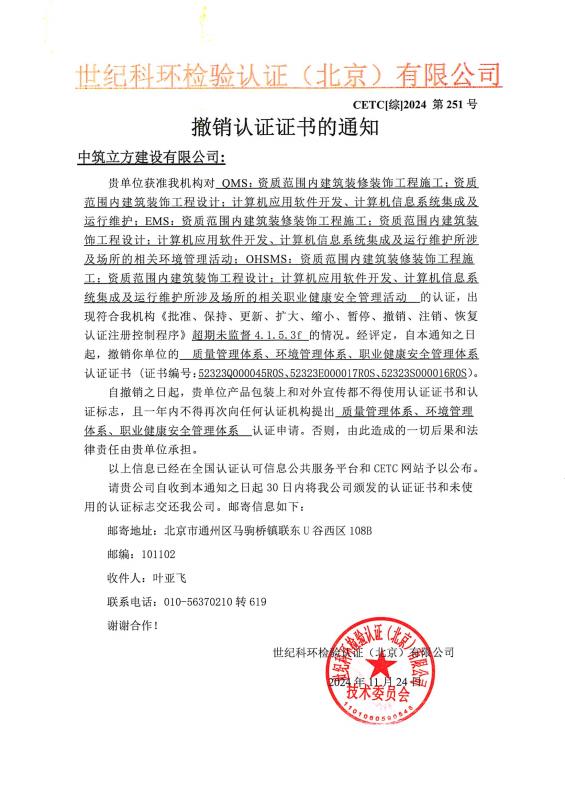 撤銷(xiāo)認(rèn)證證書(shū)的通知