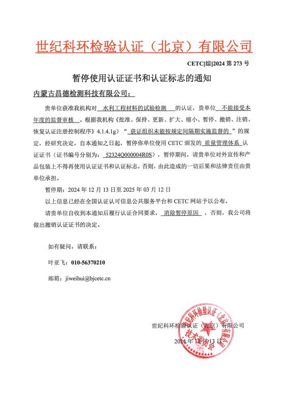 暫停使用認(rèn)證證書和認(rèn)證標(biāo)志的通知