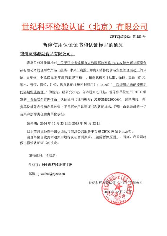 暫停使用認(rèn)證證書和認(rèn)證標(biāo)志的通知