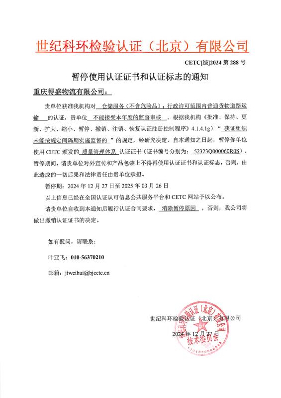 暫停使用認(rèn)證證書和認(rèn)證標(biāo)志的通知