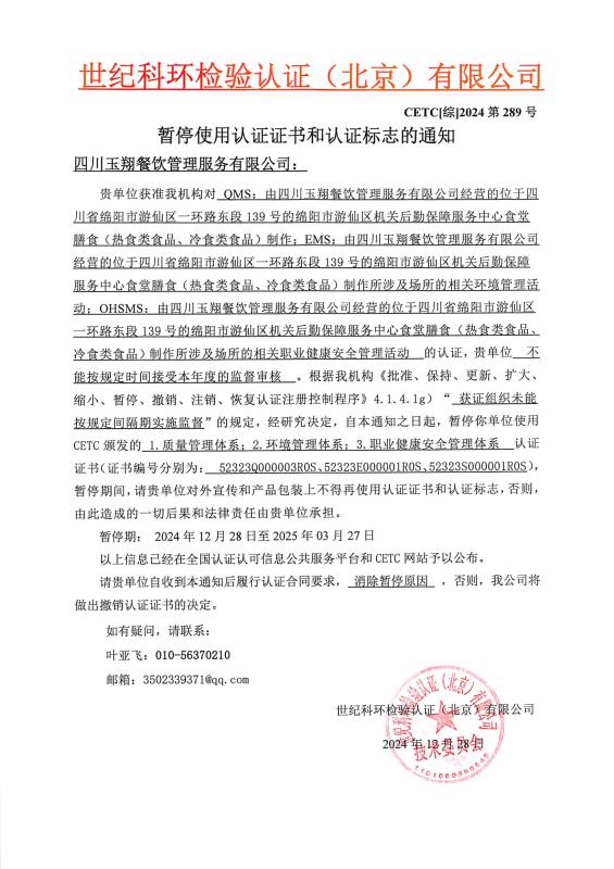 暫停使用認(rèn)證證書和認(rèn)證標(biāo)志的通知