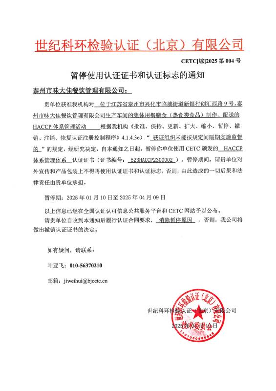 暫停使用認(rèn)證證書和認(rèn)證標(biāo)志的通知