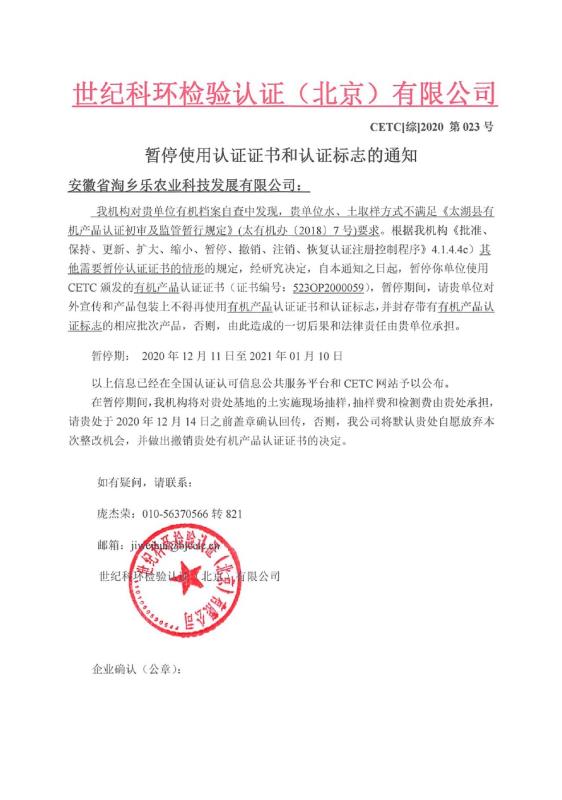 暫停使用認(rèn)證證書和認(rèn)證標(biāo)志的通知