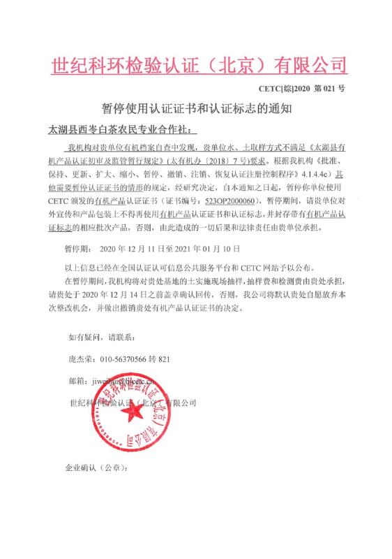 暫停使用認(rèn)證證書和認(rèn)證標(biāo)志的通知