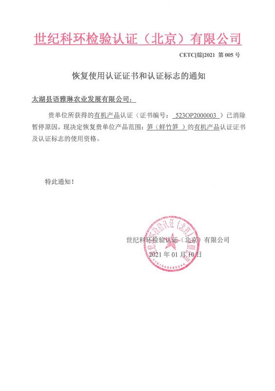 恢復(fù)使用認(rèn)證證書(shū)和認(rèn)證標(biāo)志的通知
