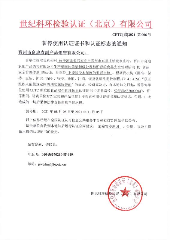 暫停使用認(rèn)證證書和認(rèn)證標(biāo)志的通知