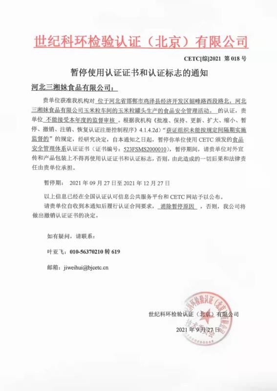 暫停使用認(rèn)證證書和認(rèn)證標(biāo)志的通知
