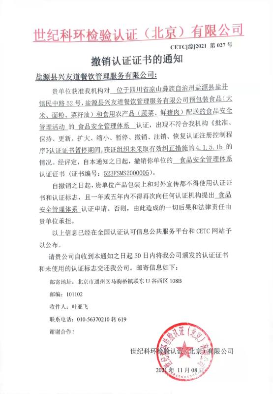 撤銷(xiāo)認(rèn)證證書(shū)的通知