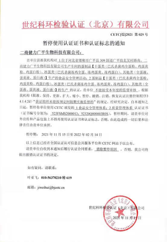 暫停使用認(rèn)證證書(shū)和認(rèn)證標(biāo)志的通知