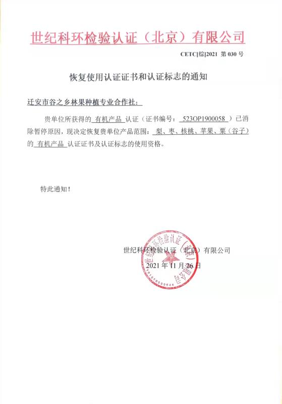 恢復(fù)使用認(rèn)證證書和認(rèn)證標(biāo)志的通知