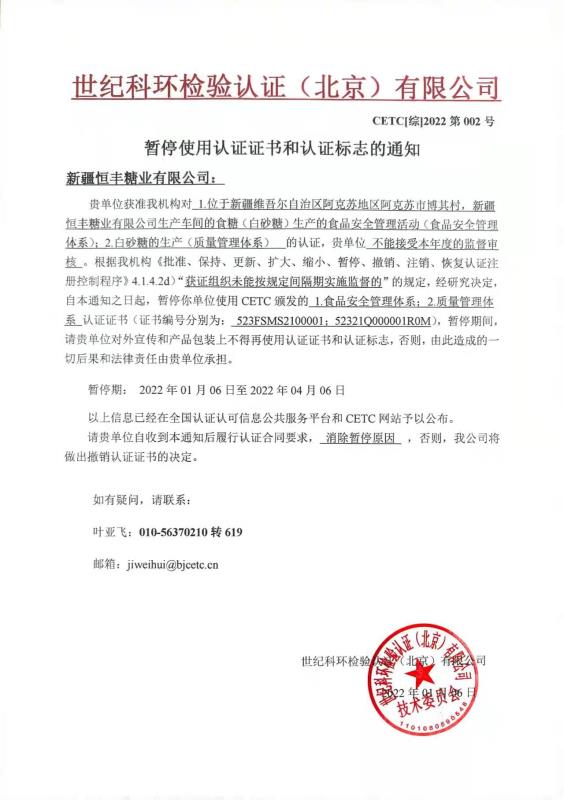 暫停使用認(rèn)證證書和認(rèn)證標(biāo)志的通知