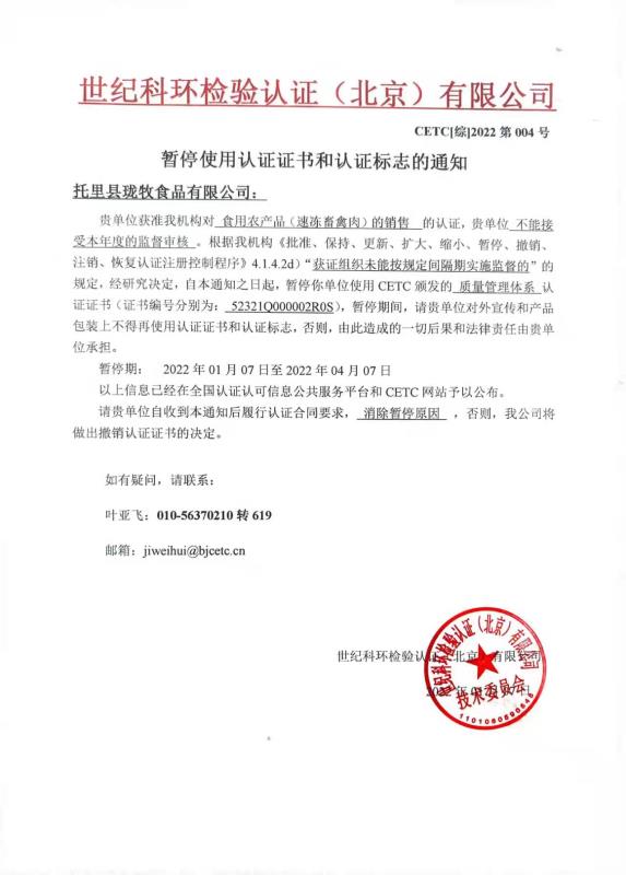暫停使用認(rèn)證證書和認(rèn)證標(biāo)志的通知