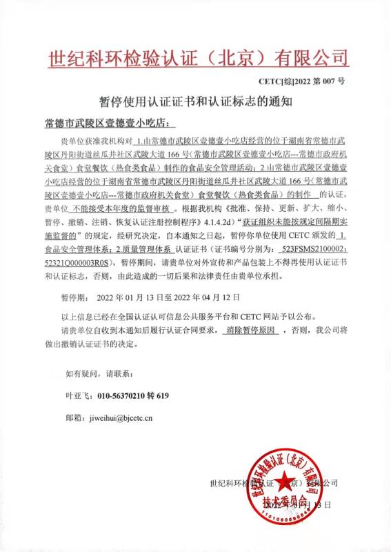 暫停使用認(rèn)證證書和認(rèn)證標(biāo)志的通知