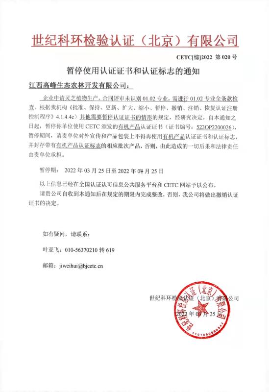 暫停使用認(rèn)證證書和認(rèn)證標(biāo)志的通知
