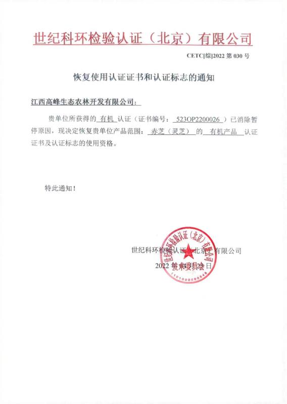 恢復(fù)使用認(rèn)證證書(shū)和認(rèn)證標(biāo)志的通知