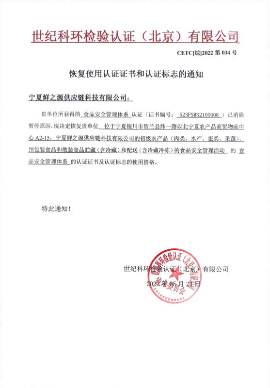 恢復(fù)使用認(rèn)證證書和認(rèn)證標(biāo)志的通知