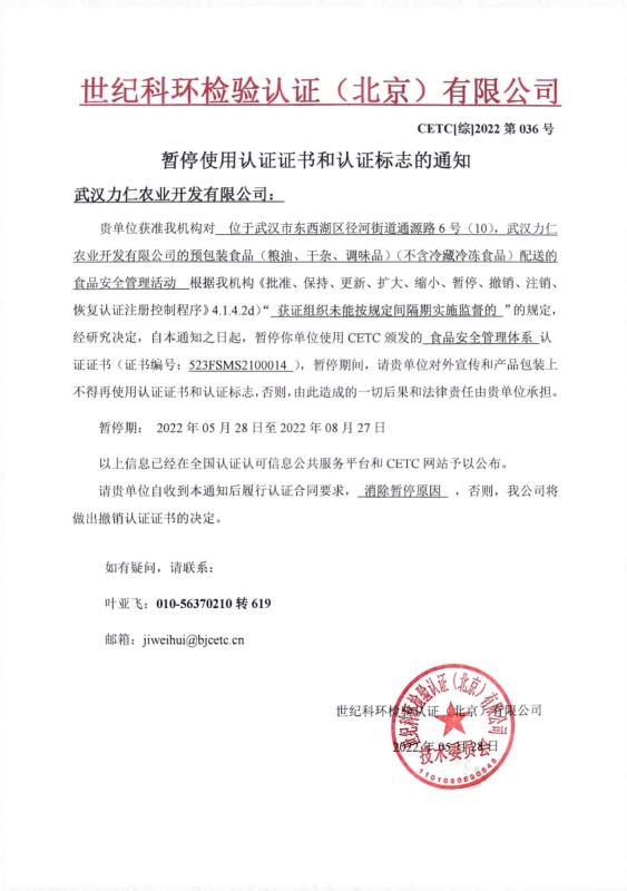 暫停使用認(rèn)證證書和認(rèn)證標(biāo)志的通知