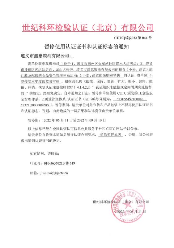 暫停使用認(rèn)證證書和認(rèn)證標(biāo)志的通知