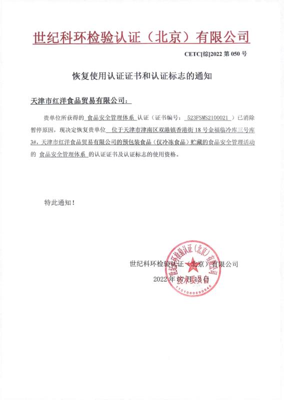 恢復(fù)使用認(rèn)證證書和認(rèn)證標(biāo)志的通知