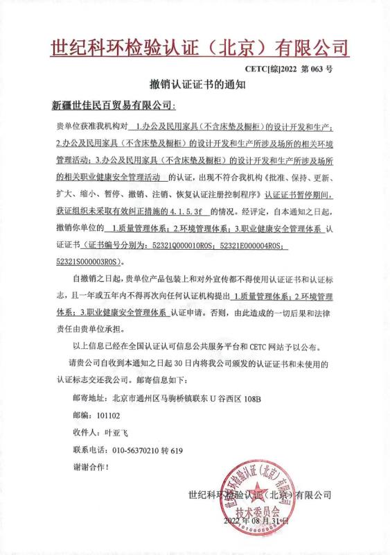 撤銷(xiāo)認(rèn)證證書(shū)的通知
