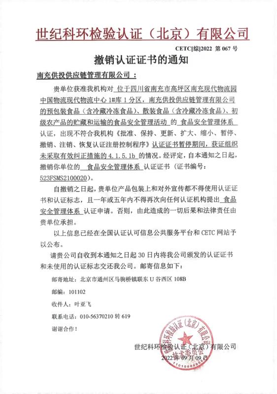 撤銷(xiāo)認(rèn)證證書(shū)的通知