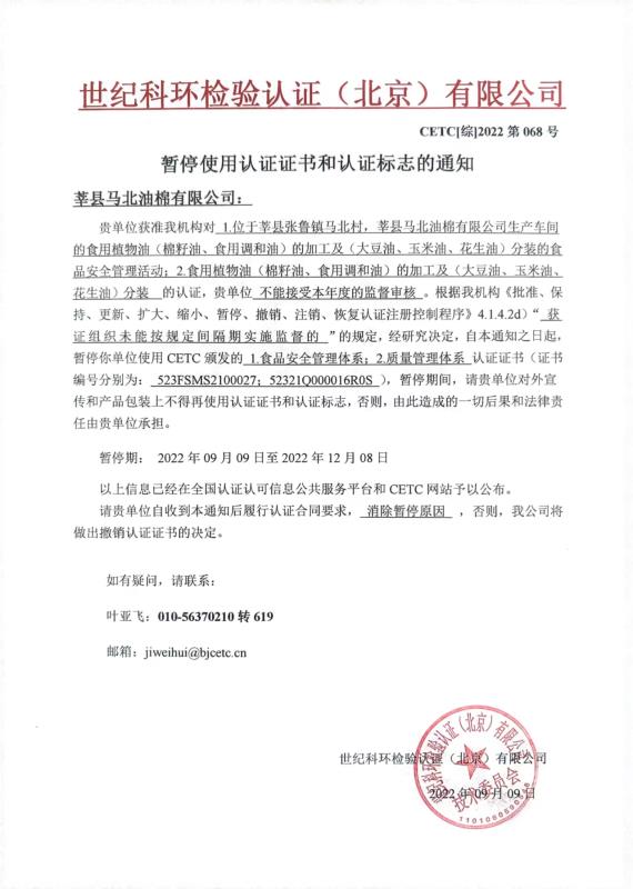 暫停使用認(rèn)證證書(shū)和認(rèn)證標(biāo)志的通知