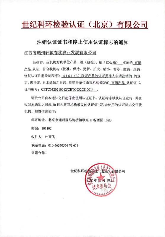 注銷認(rèn)證證書和停止使用認(rèn)證標(biāo)志的通知