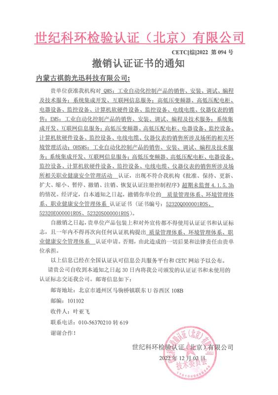 撤銷(xiāo)認(rèn)證證書(shū)的通知