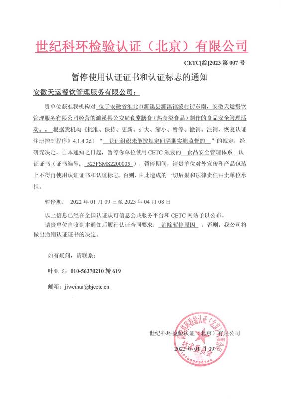 暫停使用認(rèn)證證書(shū)和認(rèn)證標(biāo)志的通知