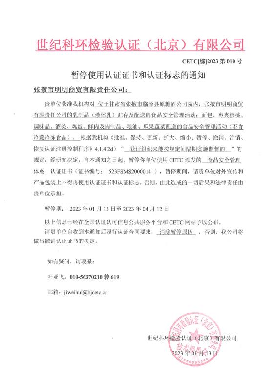 暫停使用認(rèn)證證書和認(rèn)證標(biāo)志的通知