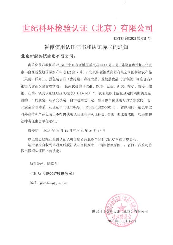 暫停使用認(rèn)證證書和認(rèn)證標(biāo)志的通知