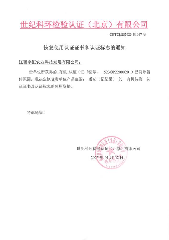 恢復(fù)使用認(rèn)證證書和認(rèn)證標(biāo)志的通知