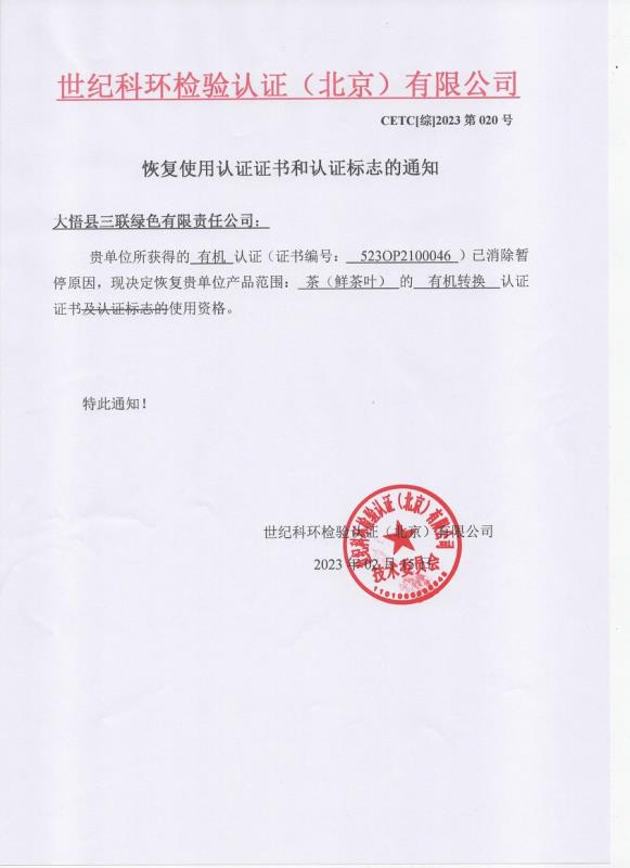 恢復(fù)使用認(rèn)證證書和認(rèn)證標(biāo)志的通知