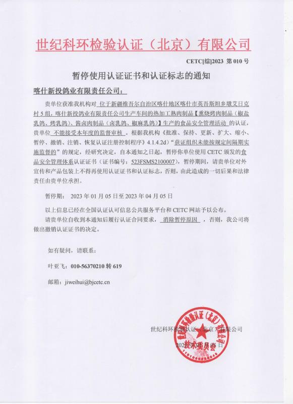 暫停使用認(rèn)證證書和認(rèn)證標(biāo)志的通知