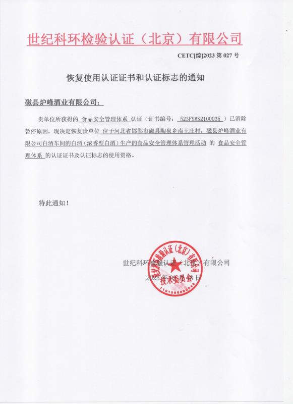 恢復(fù)使用認(rèn)證證書和認(rèn)證標(biāo)志的通知