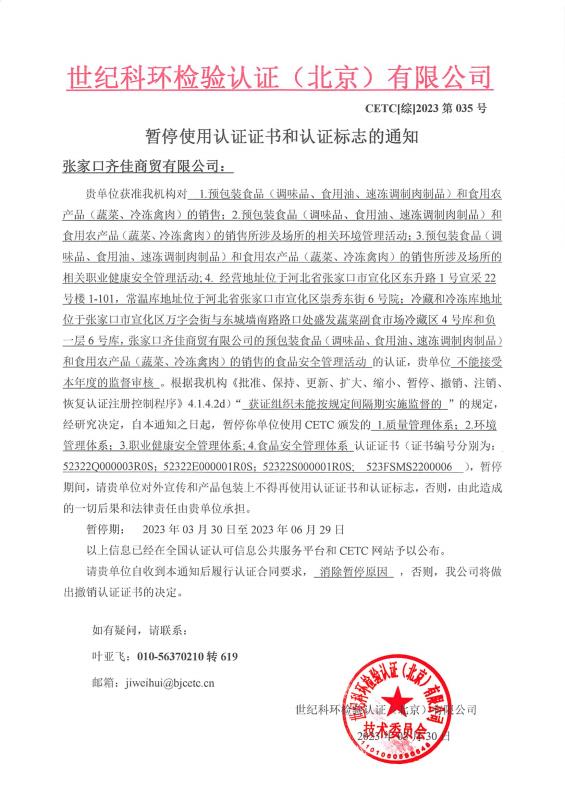 暫停使用認(rèn)證證書(shū)和認(rèn)證標(biāo)志的通知