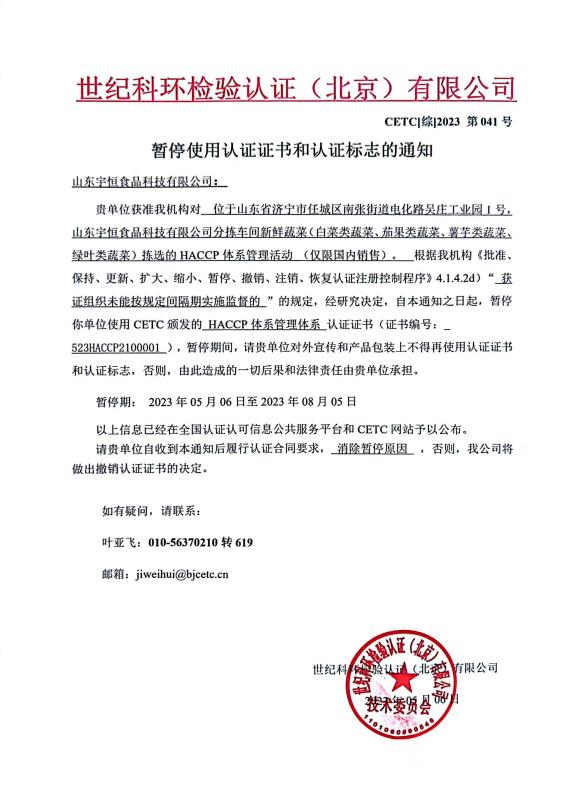 暫停使用認(rèn)證證書和認(rèn)證標(biāo)志的通知