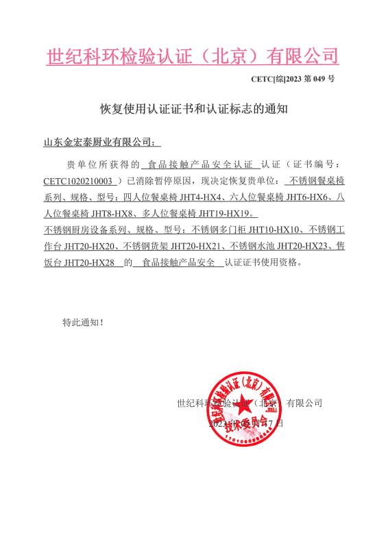 恢復(fù)使用認(rèn)證證書(shū)和認(rèn)證標(biāo)志的通知